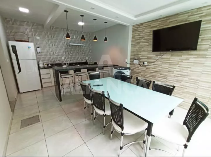 Sala de estar, sala de jantar, escritório, lavabo, 03 quartos com armários sendo 01 suíte, banheiro social com box e armários, cozinha com armários, área de serviço, área de lazer com cozinha com armários, bancada, jacuzzi