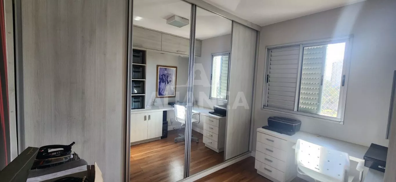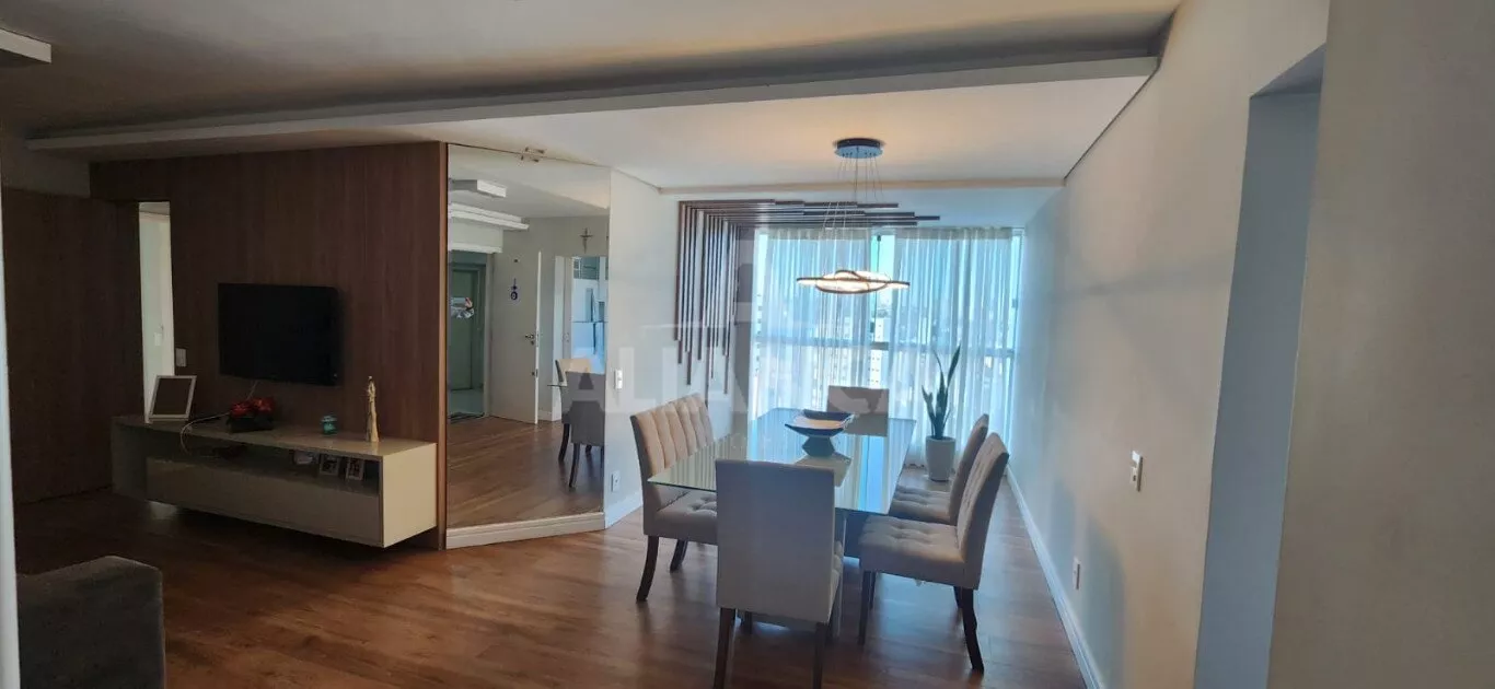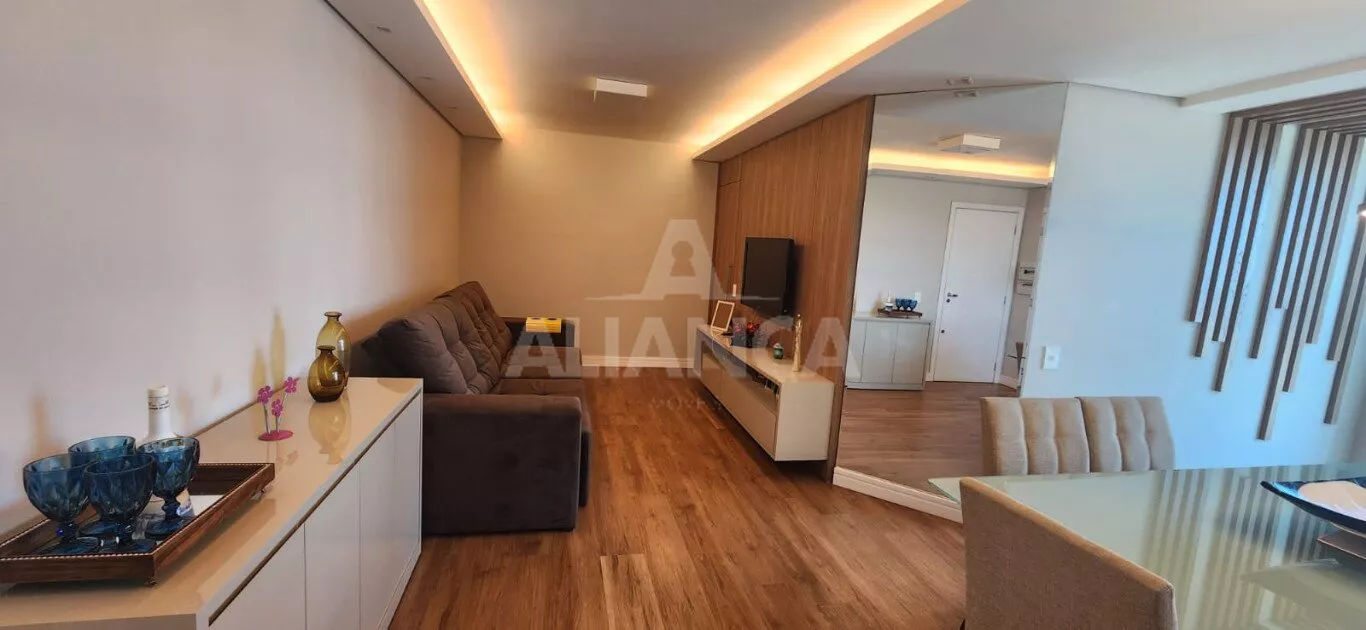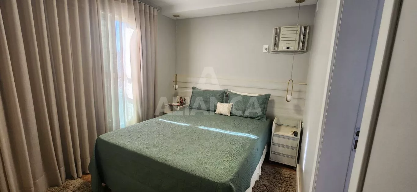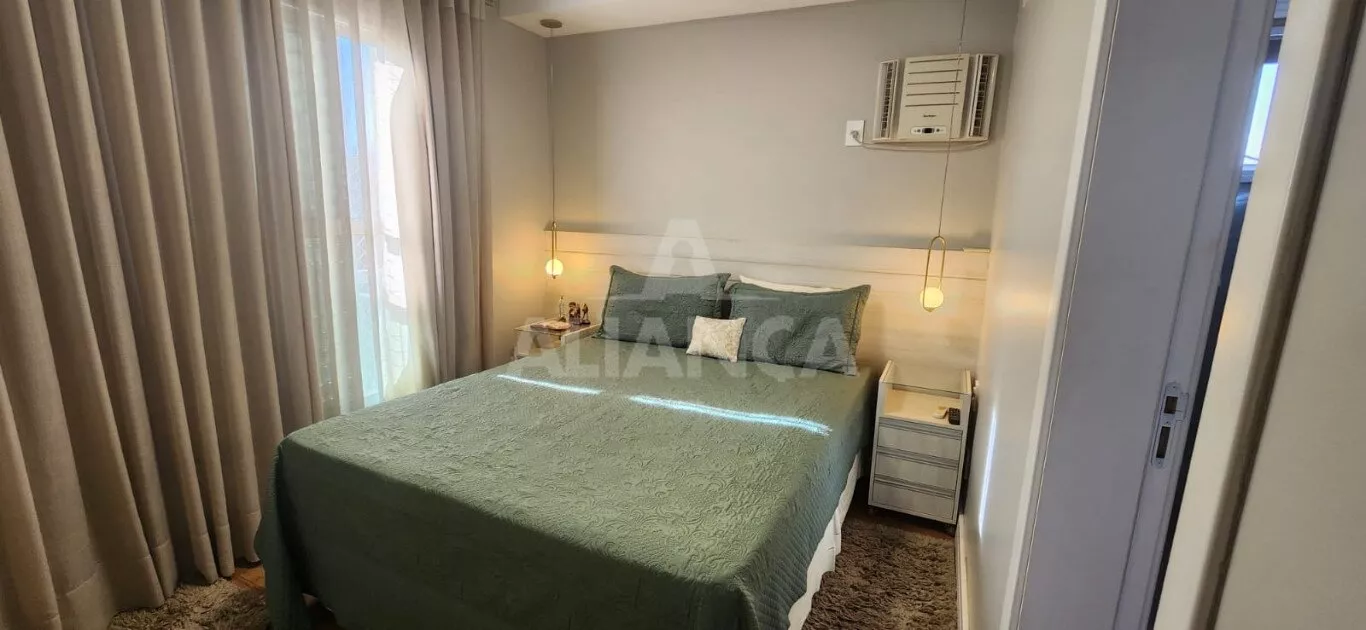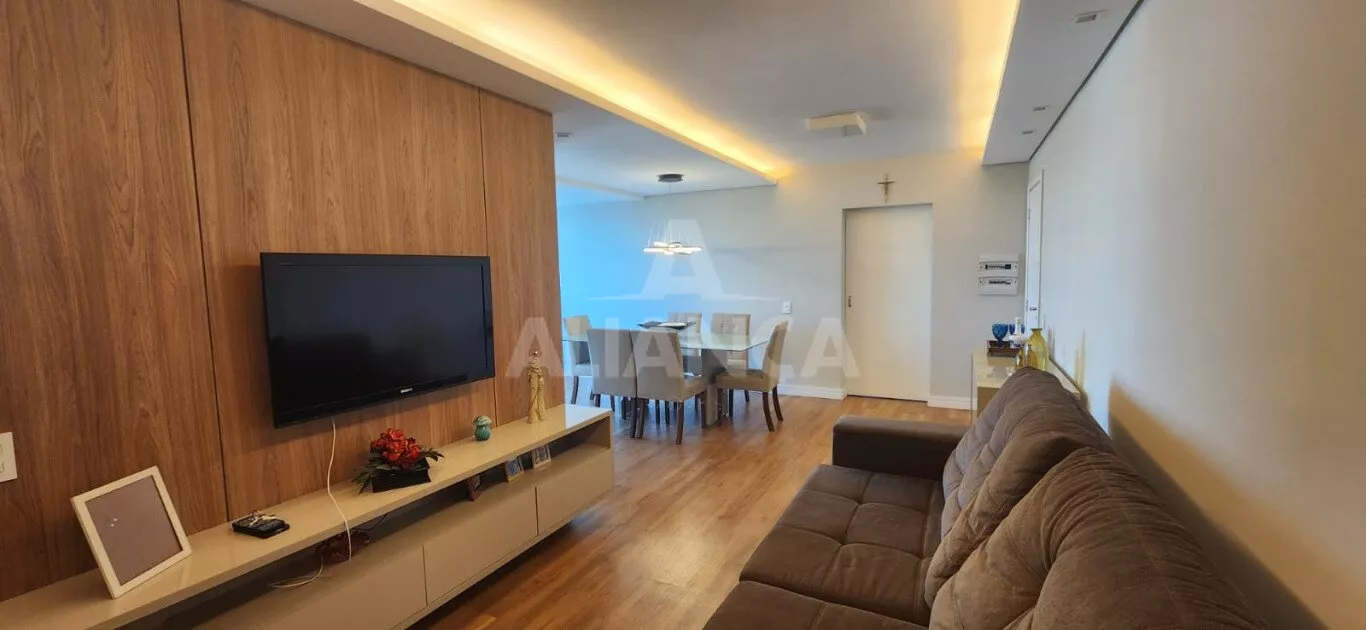 Apartamento todo mobiliado sendo sala em 02 ambientes com sofá, mesa com 06 cadeiras, painel, rack e TV, 03 quartos sendo 01 suíte todos com armários embutidos sendo 01 deles funcionando como closet e escritório, 02 camas de casal, banheiro social com armários e box, cozinha planejada com geladeira, coifa, cooktop, forno microondas e elétrico, utensílios de cozinha, vaga de garagem para 02 carros.