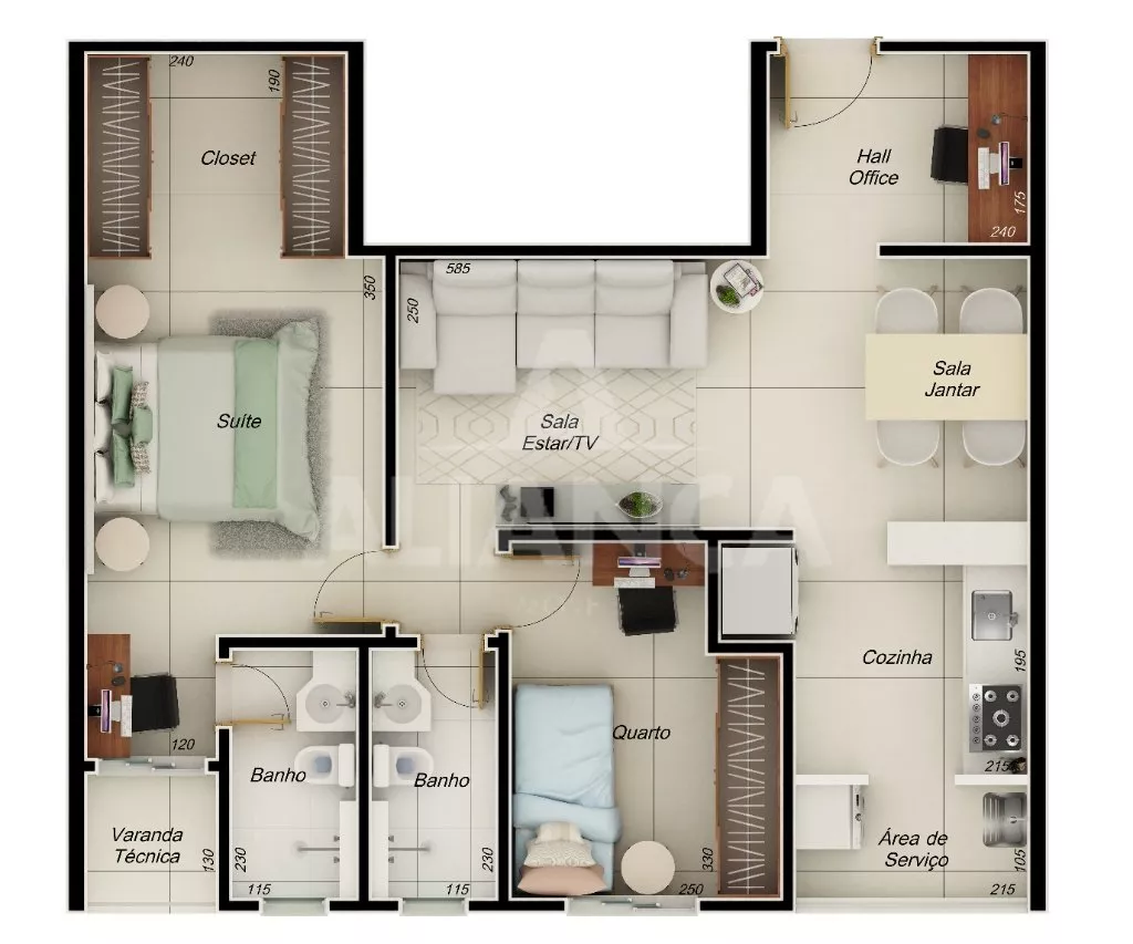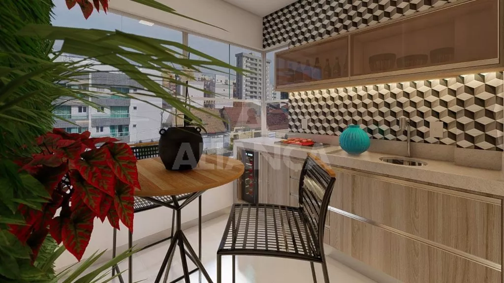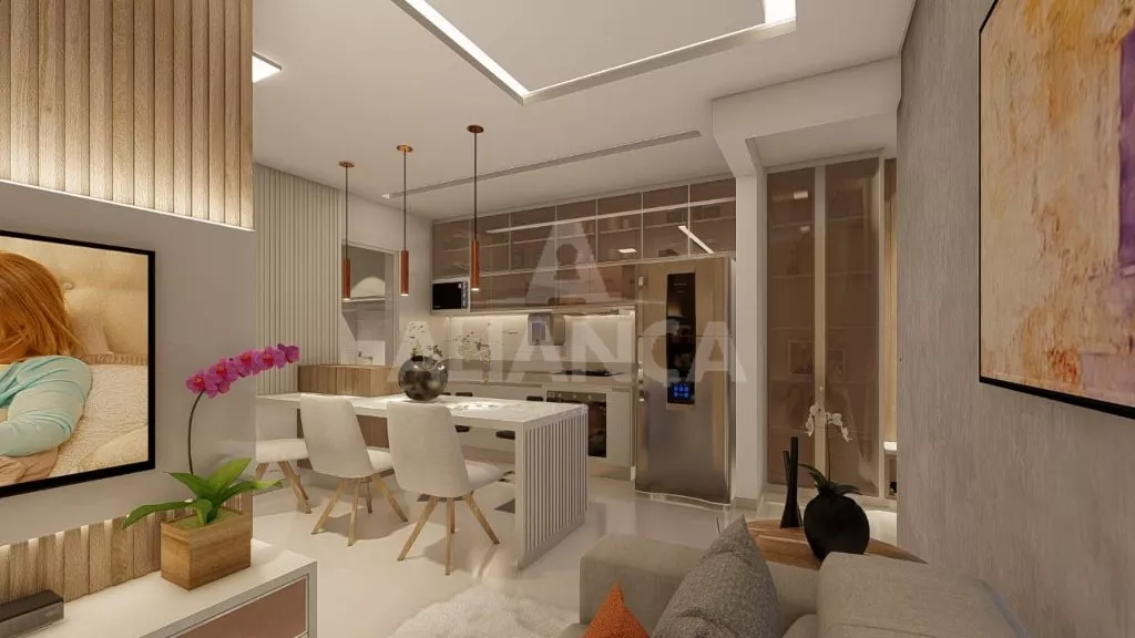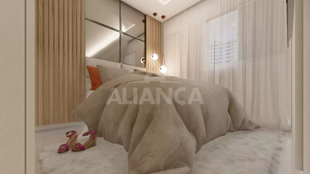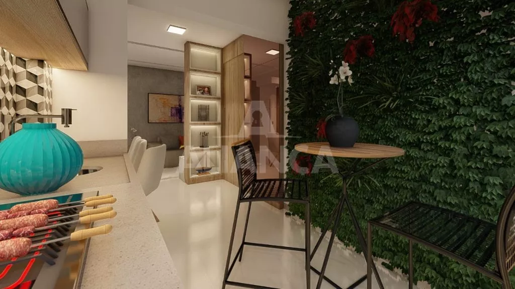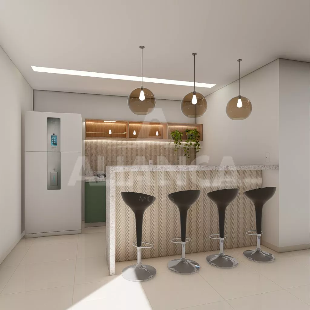 Sala com varanda, cozinha, banheiro social, 02 quartos sendo 01 suíte, garagem para 02 carros, 02 elevadores, salão de festas.