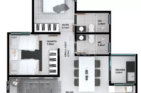 • 2 quartos, sendo 1 suíte