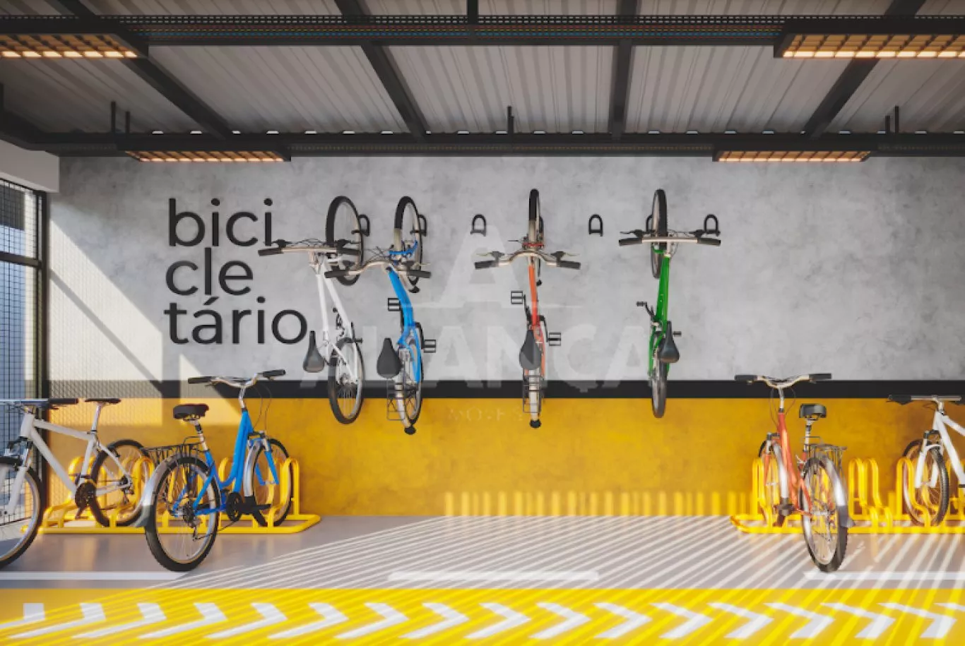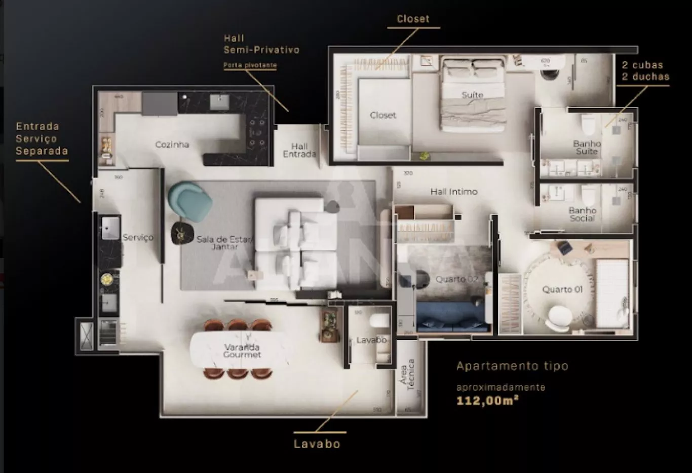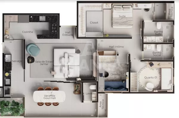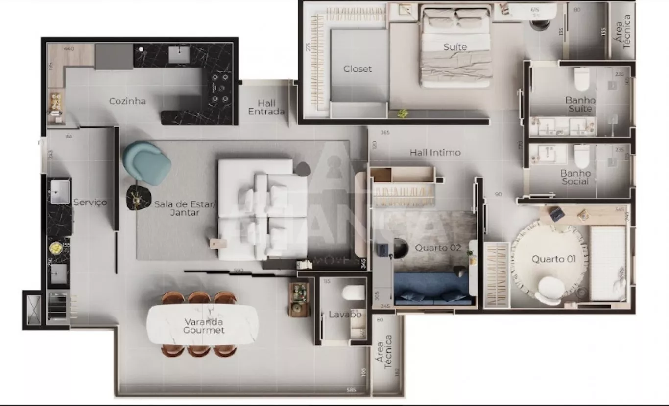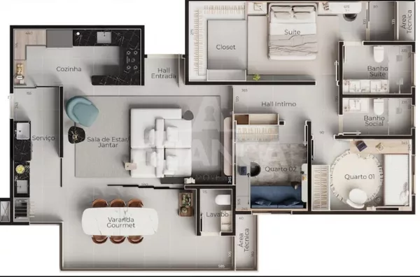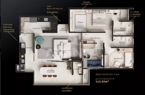 Sala de estar com varanda gourmet, (churrasqueira a carvão a ser adquirida separadamente), lavabo, 03 quartos sendo 01 suíte, banheiro social, cozinha, área de serviço, elevador, espaço pet, play ground, salão de festas, academia, bicicletário, espaç;o grill, área gourmet, sport bar, piscina, 02 vagas de garagem, com disponibilidade de instalação de tomada individual para carro elétrico. home cinema, coworking, laje técnica.