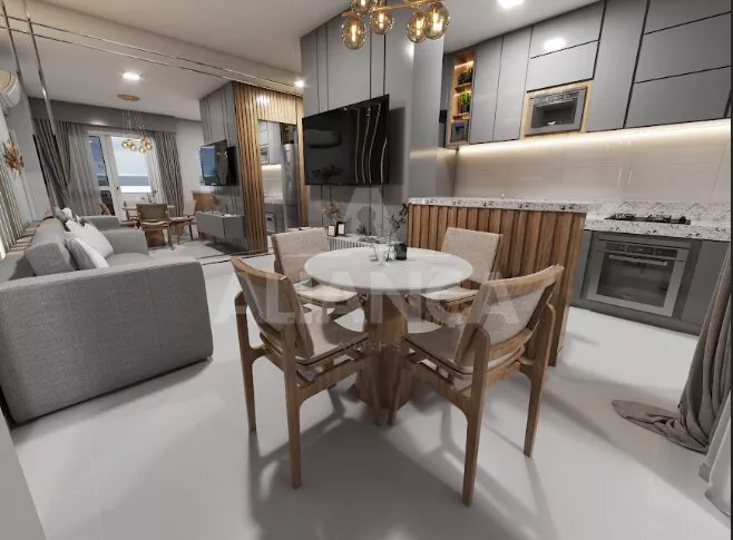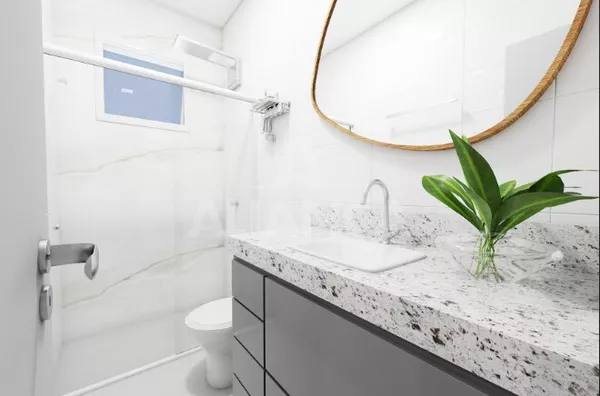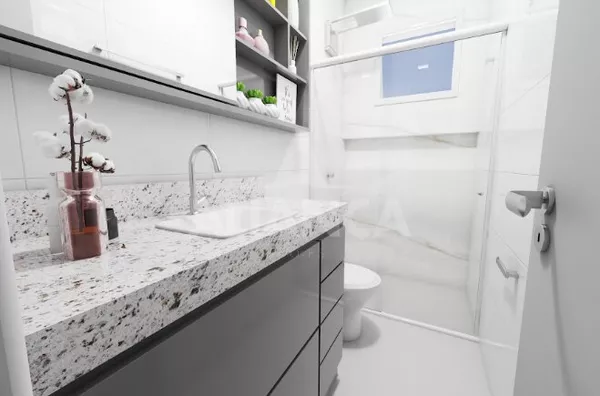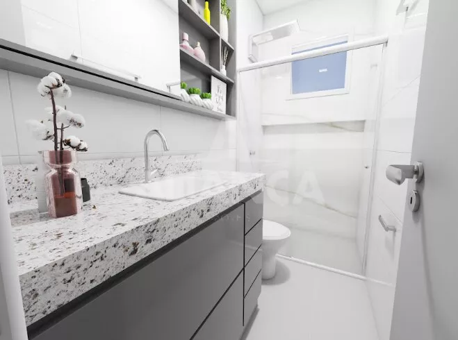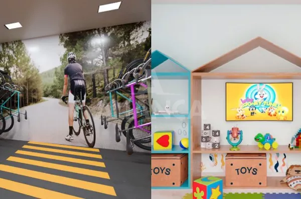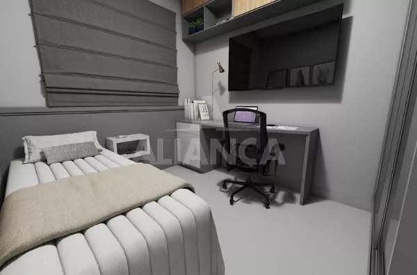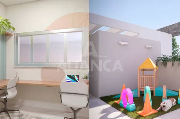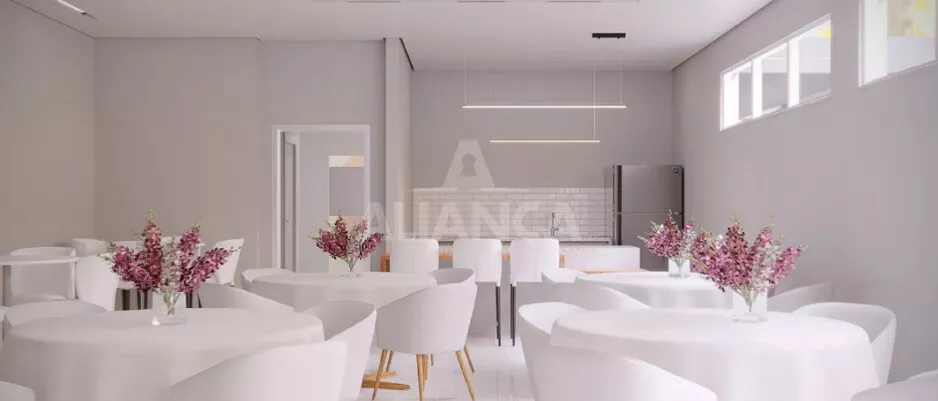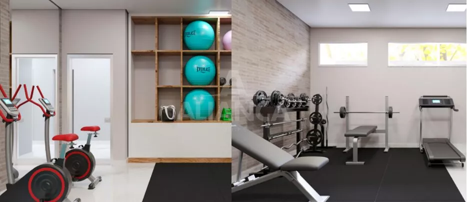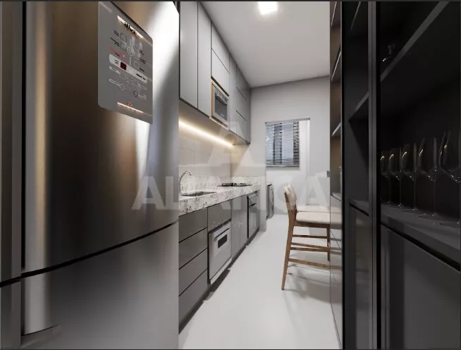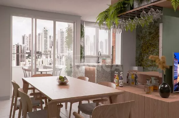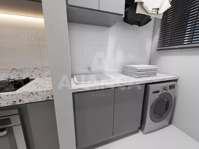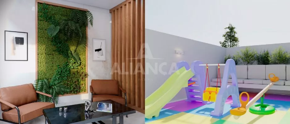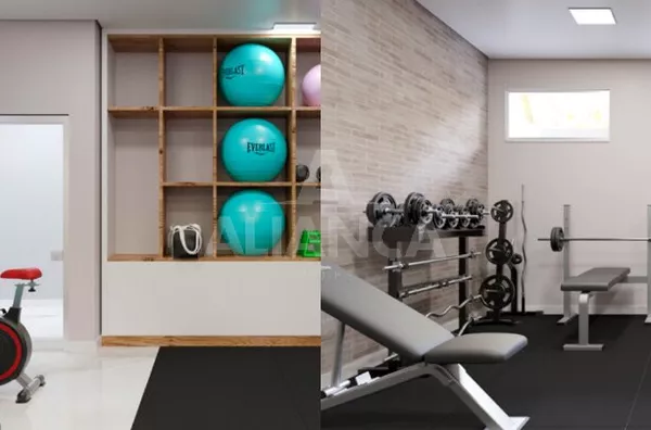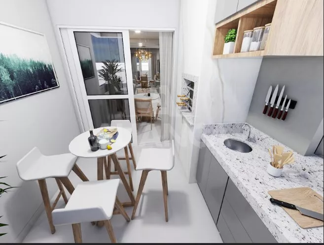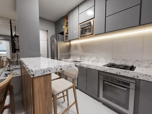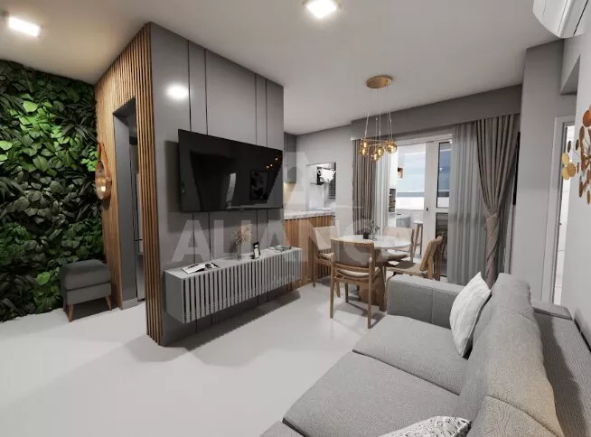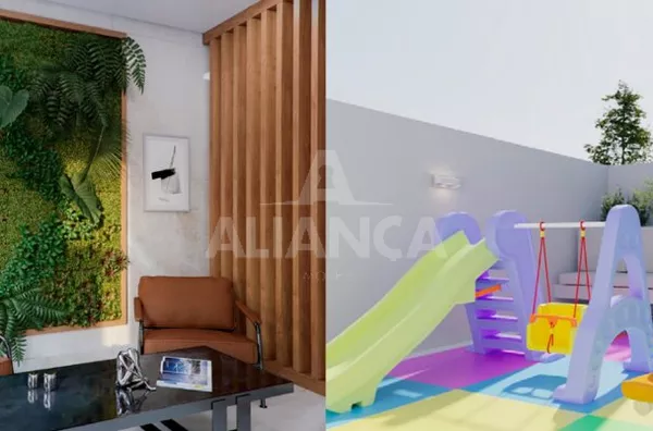 Sala de estar em dois ambientes com varanda com duto para churrasqueira á carvão, 02 quartos sendo 01 suíte, banheiro social, cozinha, área de serviço, garagem, 02 elevadores, espaço fitness, brinquedoteca, salão de festas, acabamento alto padrão, 03 pavimentos de garagem, conforto térmico e acústico, gás canalizado, pré estrutura para ar condicionado na sala e suíte, estrutura para portaria 24 hs