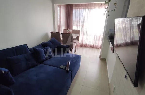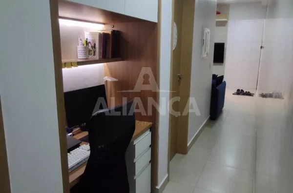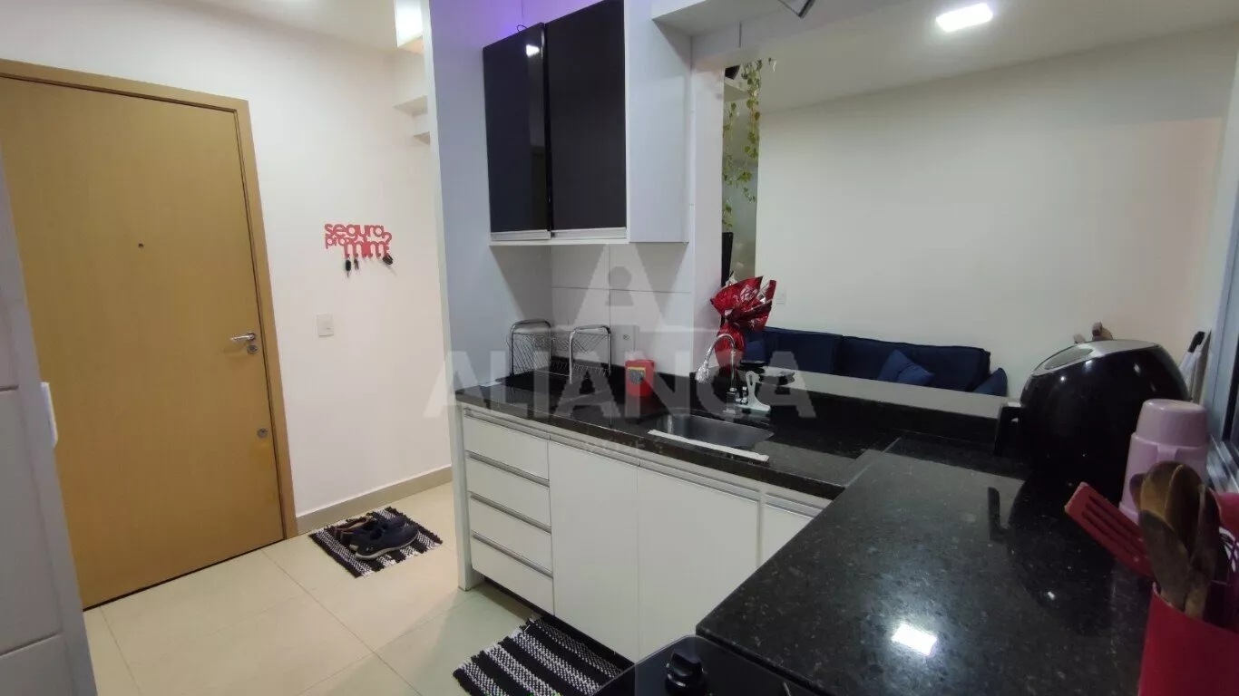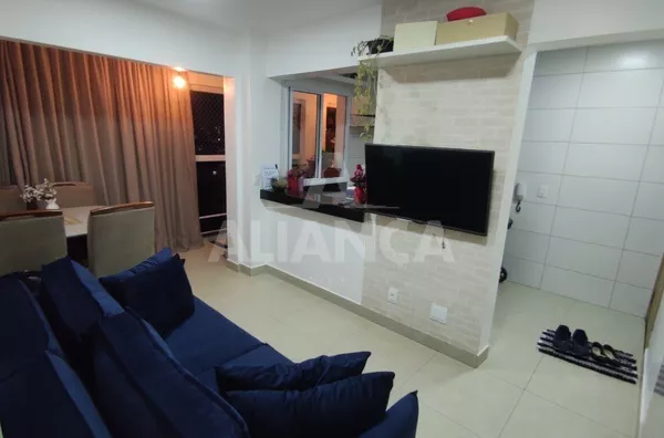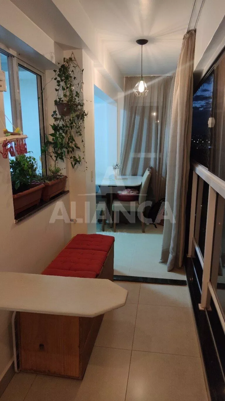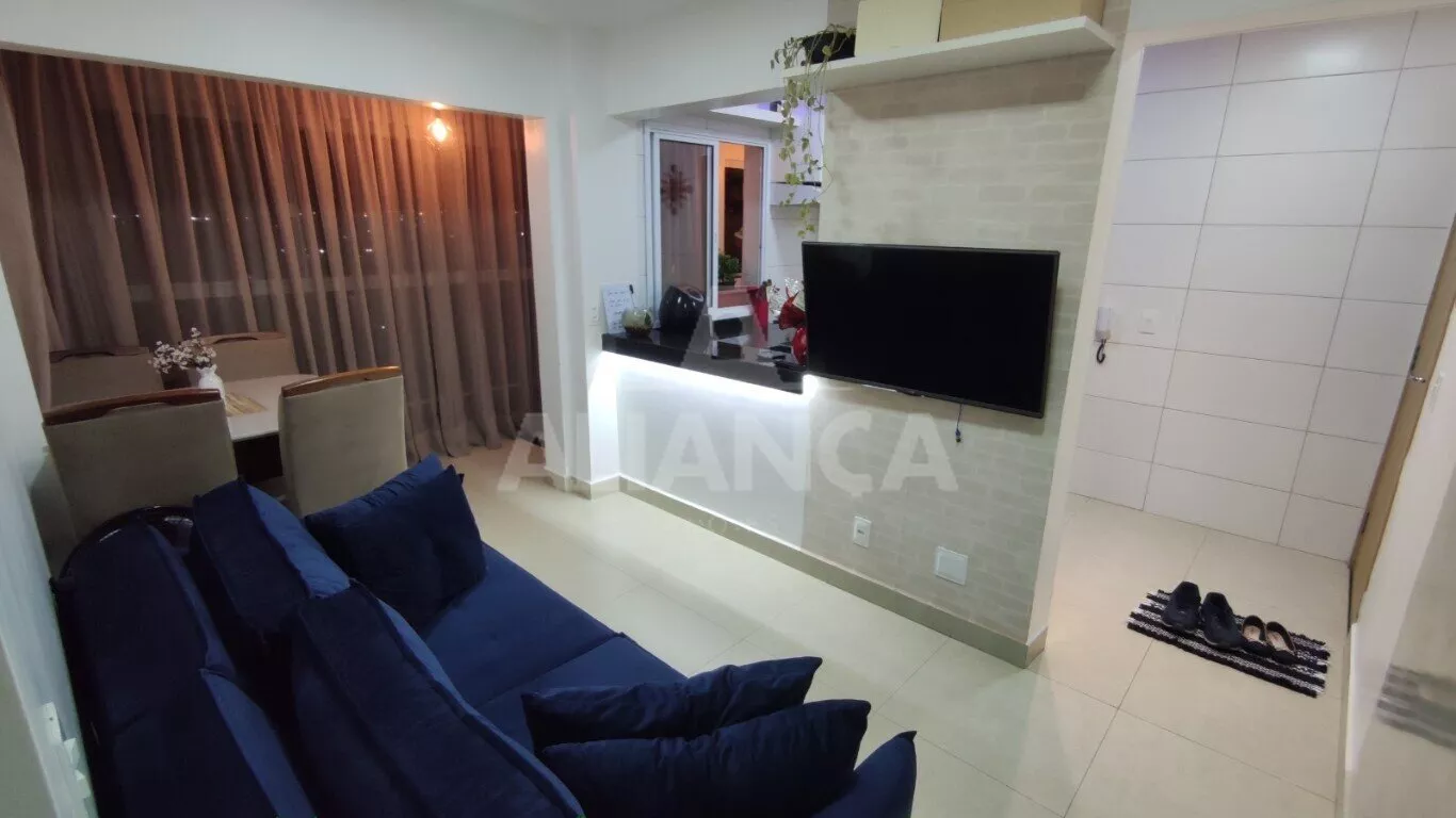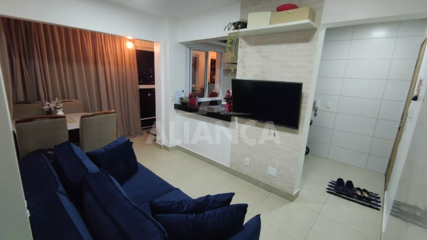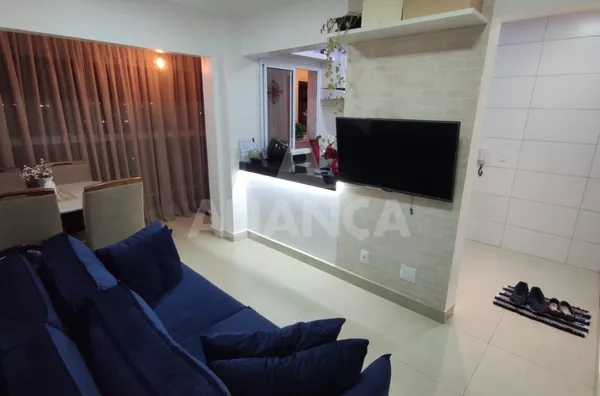 Sala de estar em dois ambientes com varanda gourmet, Cozinha americana, 02 quartos sendo 01 suíte, banheiro social, área de serviço, 01 vaga, elevador, portaria 08 horas, área de academia, churrasqueira, ponto de gás na sacada, vidros com película de redução de calor e tela de proteção em todas as janelas e varanda, vista privilegiada.