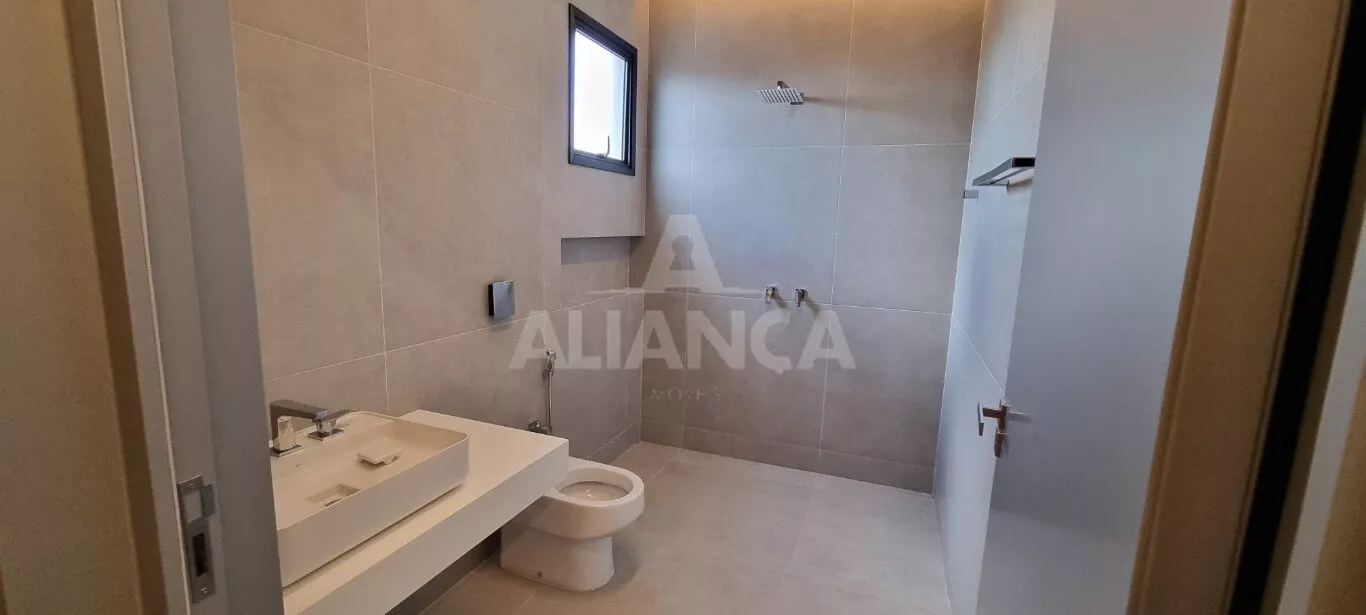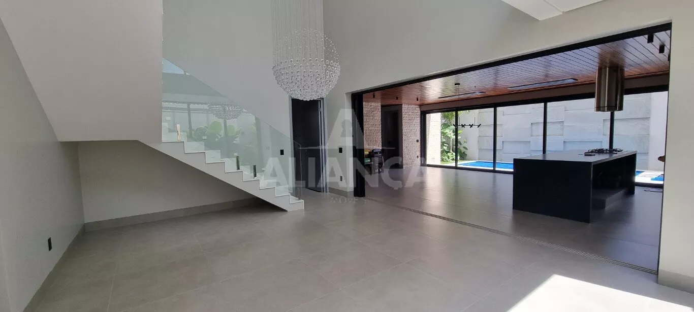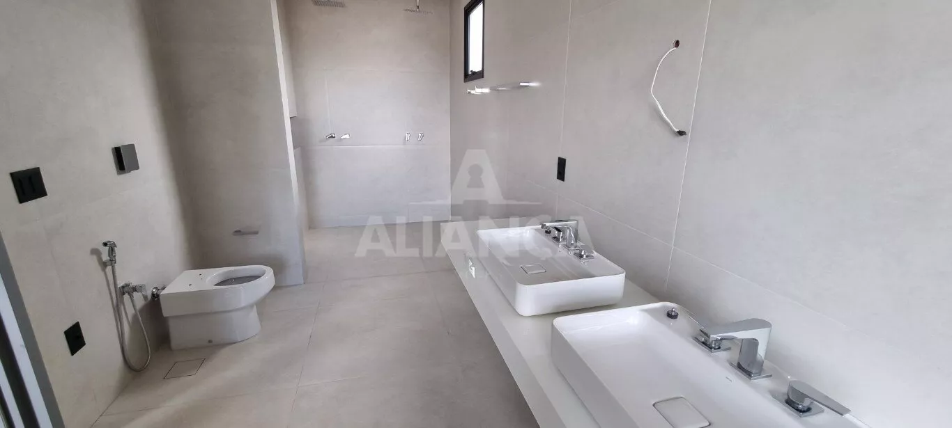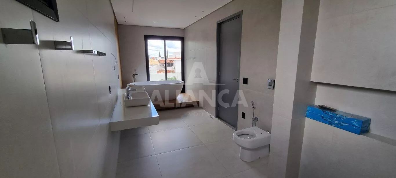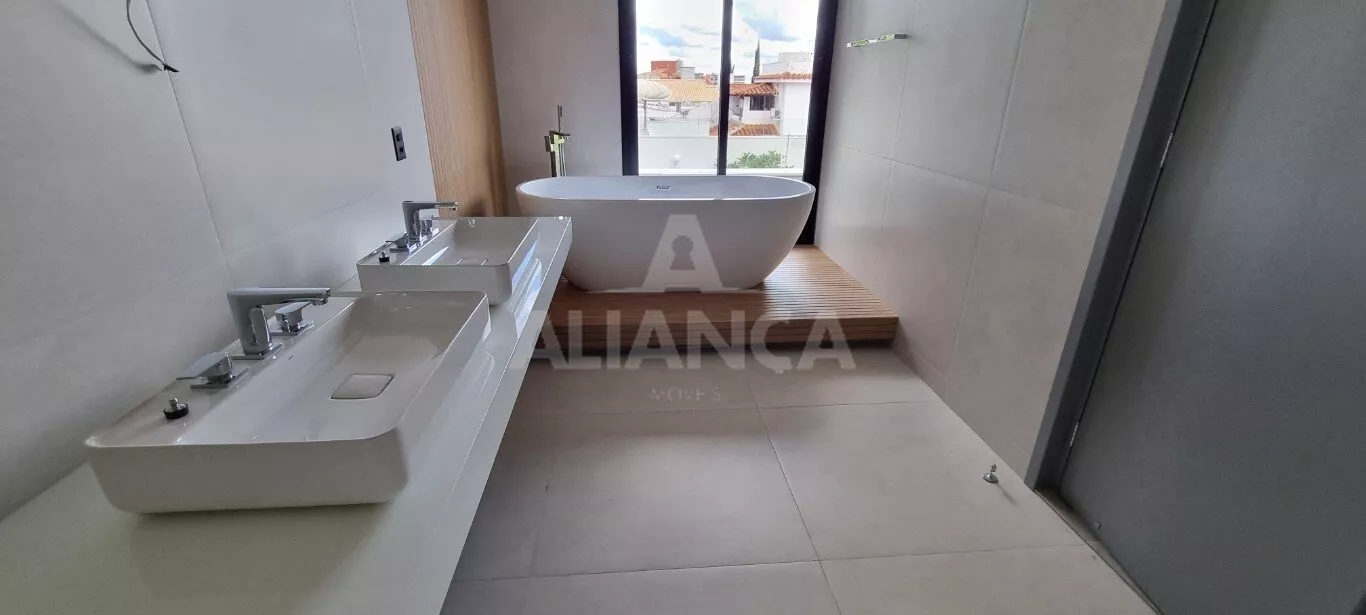 Imóvel 02 pavimentos, alto padrão, excelente acabamento, primeiro piso Sala de estar, sala jantar com pé direito duplo, sala de TV, escritório, cozinha integrada com área gourmet com ilha e churrasqueira tipo parrilla, lavabo masculino e feminino, área de serviço, depósito, garagem para 04 carros, piscina aquecida toda revestida em porcelanato, trocador de calor, gerador de cloro, automatização completa, spa com jatos de hidromassagem e led multicoloridos, segundo piso - mini copa para atendimento rápido ao segundo piso, 04 suítes, 03 com varanda, 01 master com closet e banheira de imersão, portas internas em ACM, projeto luminotécnico, piso porcelanato portinari 90x90, bancadas e escada em nonoglass branco, soleiras e bordas da piscina em mármore dolomiítico branco paraná montecristo, bacias e metais Deca e Docol, todas as suítes com ponto para ar condicionado cassete, sala de tv e área gourmet já climatizada com ar condicionado cassete de teto, venezianas automatizadas, preparação para ar condicionado, jardinagem com irrigação automatizada, sistema de alarme , cercas e CFTV instalados e funcionando, o imóvel conta com aquecimento solar de água e usina fotovoltáica com capacidade de geração de 900 kw mês, localização privilegiada.