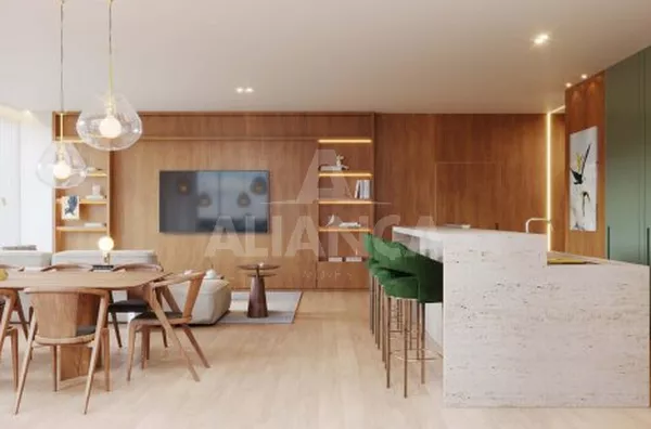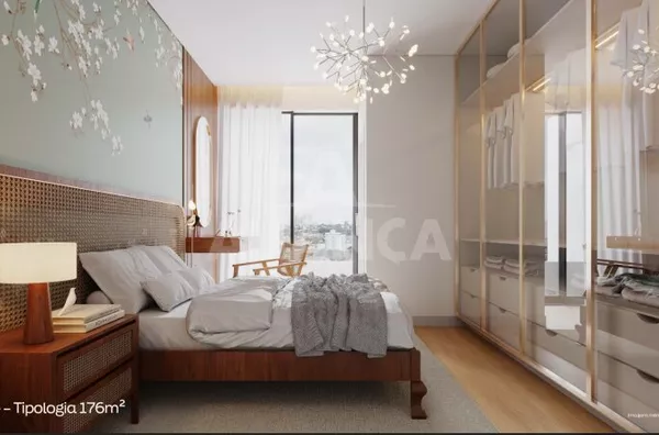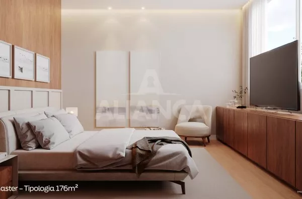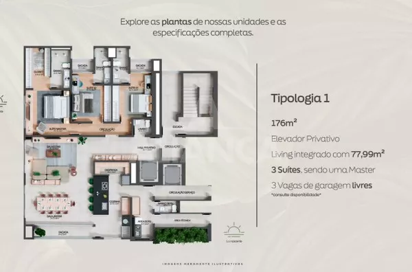 - Unidades de 176m2: Formado por elevador social em hall privativo,sala de tv, lavabo, sala de jantar, despensa, cozinha, área de serviço, banheirode serviço, hall de serviço com acesso a elevador de serviço, área técnica(destinado a condensadoras de ar condicionado), sacada, suíte 01, closet, banho suíte 01, suíte 02, banho suíte 02, sacada, suíte 03, banho suíte 03 e sacada, salão de festas salão de jogos, academiam, área gourmet.