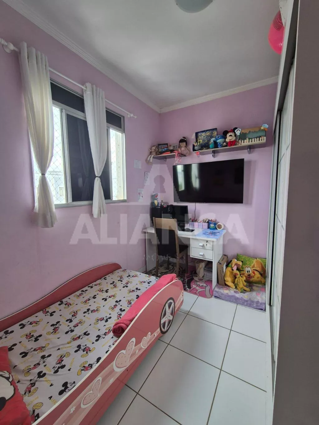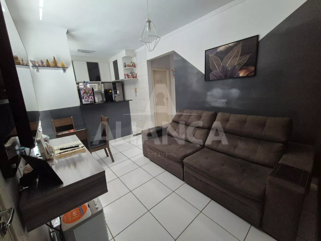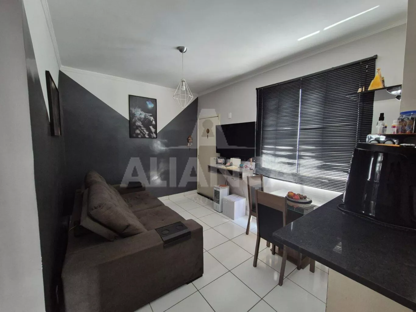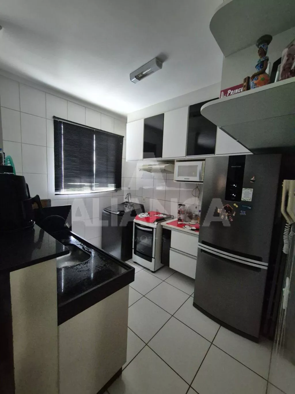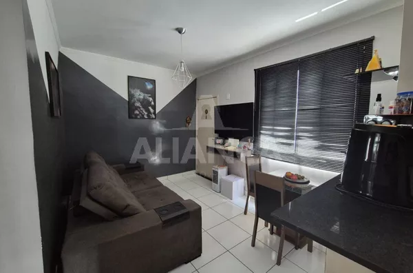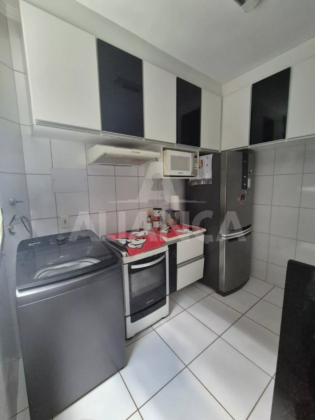 Sala de estar, 02 quartos sendo 01 com armário, banheiro social com armário, cozinha planejada, área de serviço com armário, garagem para 01 carro, portaria 24 hs, playground, quadra poliesportiva, salão de festas, gás canalizado.