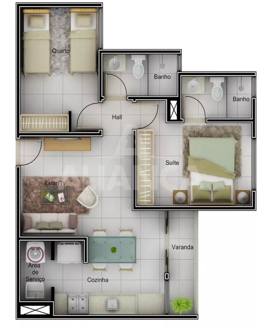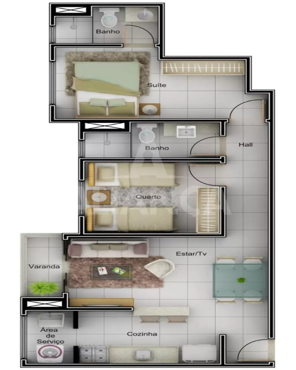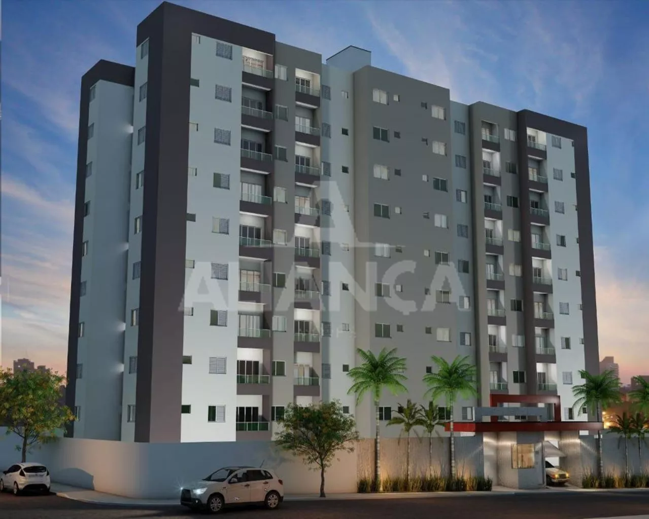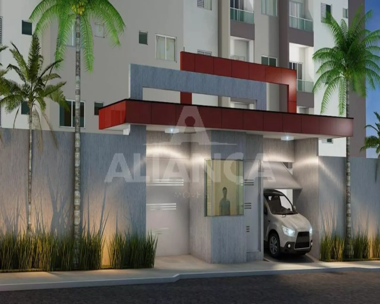 Sala de estar com sacada, 02 quartos sendo 01 suíte, banheiro social, cozinha, área de serviço, 01 vaga de garagem, preparação para portaria 24 hs, elevador, quiosque, ótimo acabamento.